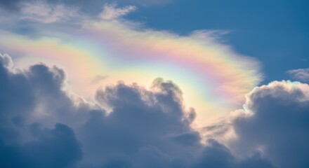 Cloud iridescence shows pastel rainbow above soft gray billows against bright blue sky backdrop