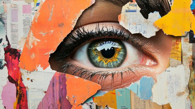 Portrait collage painting close-up facial shot with eye contact print design art poster.