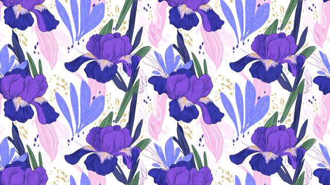 Seamless pattern featuring a vibrant purple iris collage with hand drawn line art and watercolor doodle elements on a clean white background