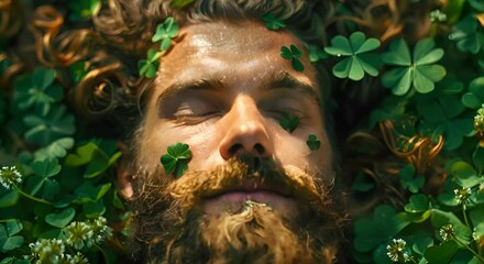 St Patrick's Day Concept: Bearded Man Sleeping on Clovers with Beer Mug. Concept St Patrick's Day, Sleep, Clovers, Beer, Bearded Man