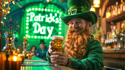 St. Patrick's day leprechaun drinking a beer in an irish pub, saint patrick day neon text in the background of the bar, smiling and wearing a green costume and hat