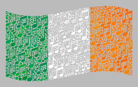 Mosaic waving Ireland flag constructed with musical notes. Vector melody mosaic waving Ireland flag combined for party purposes. Ireland flag collage is made with random melody icons.