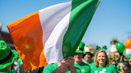 Person holding an irish flag with orange green and white colors surrounded by people wearing green clothing and hats