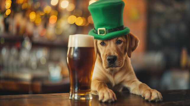 Dog in Saint Patrick's Day leprechaun party hat with beer. Dog in irish pub. Saint Patrick's day theme