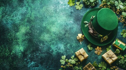A festive scene featuring green flags and a leprechaun hat with a shamrock, celebrating Irish culture and St. Patrick's Day.