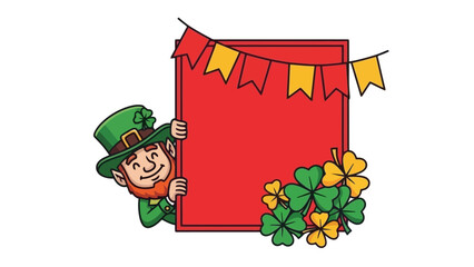 St. Patrick's Day leprechaun with red frame and shamrocks.