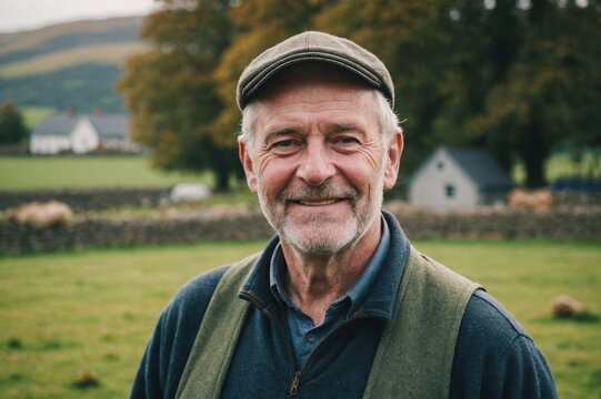 Close portrait of a smiling senior Irish male farmer standing and looking at the camera, outdoors Irish rural blurred background