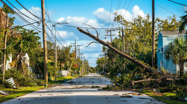 A tree has fallen on a street, and the power lines are down