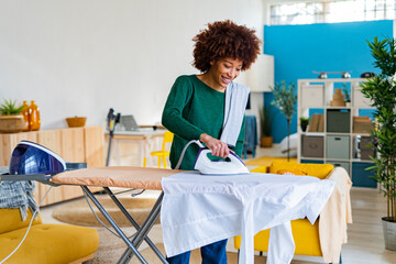 Smiling young Afro woman ironing shirt on board in living room