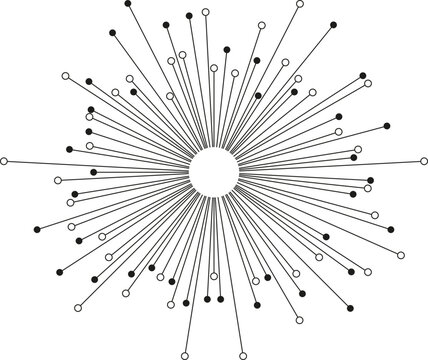 An explosion of irregular rays with dots and outline circles at the ends radiating from an empty center.