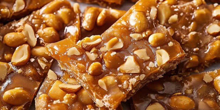 Crunchy peanut brittle close up- showcasing shattered pieces and peanuts for a satisfying bite