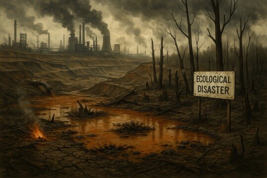 Devastated mining region revealing environmental catastrophe with polluted soil and contaminated water systems