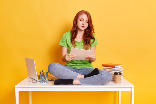Beautiful dark skinned businesswoman with casual hairstyle working on her laptop, looking at screen with concentrated face and touching chin with hand