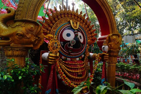 Ratha yatra festival A chariot with wooden deities of Jagannath, Baladeva and Subhadra. Holiday banner greeting card Vector illustration