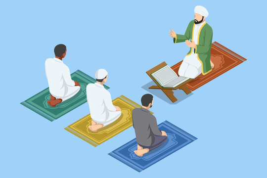 Isometric illustration of Muslim imam teaching Quran to group of men inside mosque. Islamic education and worship concept.