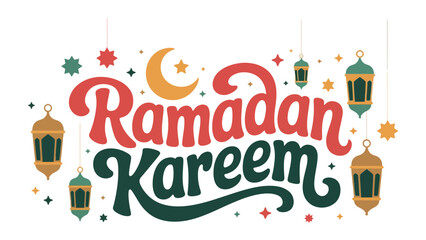 Ramadan Kareem Illustration: Festive and colorful Ramadan Kareem calligraphy with traditional lanterns and crescent moon. Evoking the spirit of celebration and cultural significance