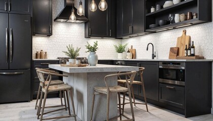 Vector art of a stylish contemporary kitchen featuring an island, ample cabinetry, and pendant lights, creating a warm and inviting atmosphere for culinary activities