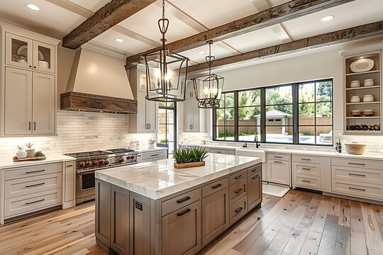 This extravagant contemporary farmhouse style kitchen features spacious white walls, cabinets, and countertops. The kitchen is equipped with bar chairs and an inviting eating counter. The exquisite