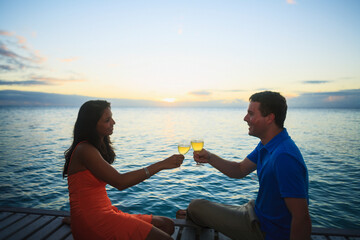 A man and woman give a toast with drinks at the bora bora nui resort and spa; Bora bora island society islands french polynesia south pacific