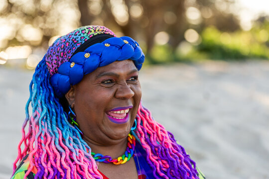Happy portrait of First Nations Australian Torres Strait Islander woman in her late fifties at beach