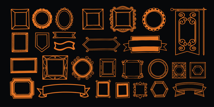 Orange geometric frames borders and decorative elements collection set isolated on black background for design projects