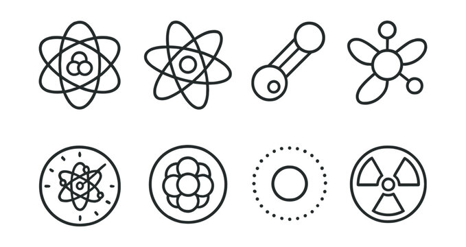 Line style icons of atomic research: atom core, orbiting electrons, isotope icon, quantum state, atomic clock, nucleus model,