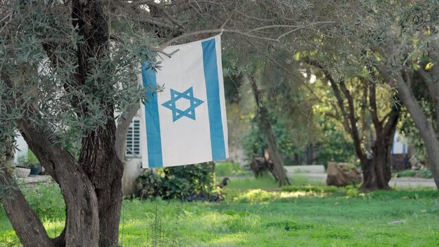 Israel national flag hanging from a tree in residential area or Israeli kibbutz. Quiet street with garden and backyard. Flag is tied to tree with green grass in background during national celebration