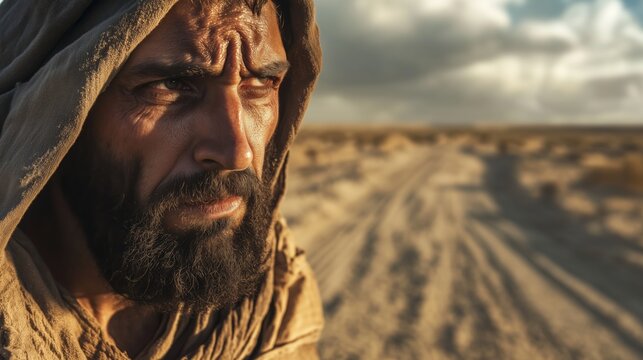Man  israelite crying while walking in a desert road. Ancient days in Israel year of 10 B.C.