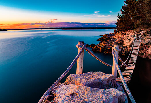 Sunset at the bridge on the Stinjan beach by the fort Punta Christo, Pula, Istra region, Croatia.