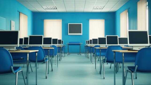 Modern Computer Lab with Rows of Desks and Monitors in Bright Blue