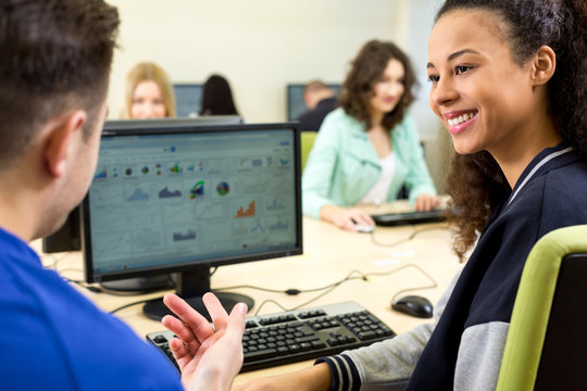 Group of students sitting at desk with computers during IT lesson in the classroom