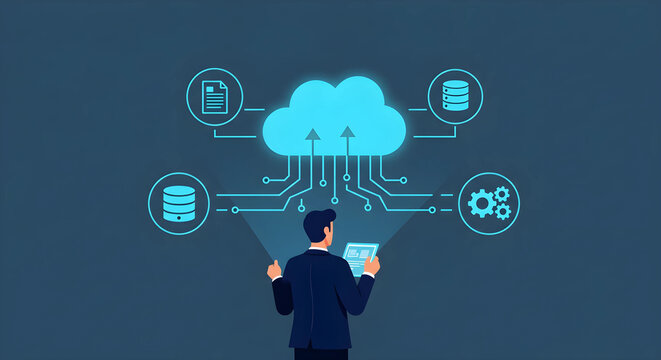 クラウドコンピューティングとSaaSのビジネスコンセプト。データを管理する人物のイラスト。ベクター背景素材。