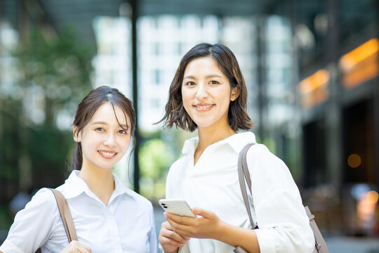 スマートフォンを持って笑顔を見せるビジネスウーマン2人