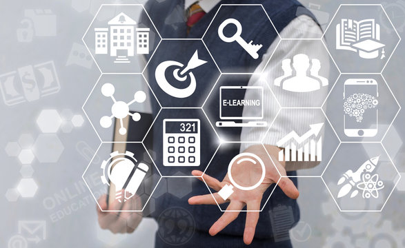 E-learning - IT Communication - internet network as knowledge base. Planning imagination education business concept. Online learning, web training. Man with book offers laptop e-learning icon.