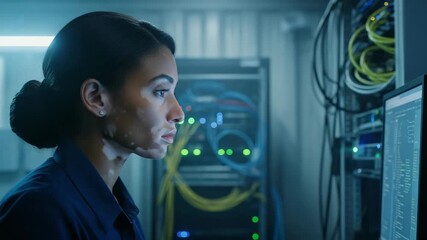 Woman with vitiligo working in server room, focused on computer screen. Woman with vitiligo is surrounded by technology and equipment, analyzing data, resolving issues,