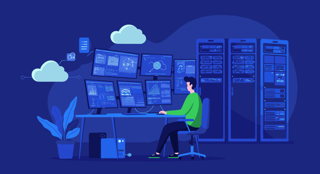 Network monitoring and management vector illustration in data center with flat design for it solutions