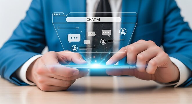 Businessman using a smartphone with a virtual interface displaying communication icons, representing modern digital technology and online networking