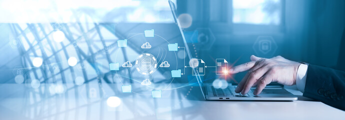 Hands of 90s IT specialist typing on vintage computer keyboard, retro office