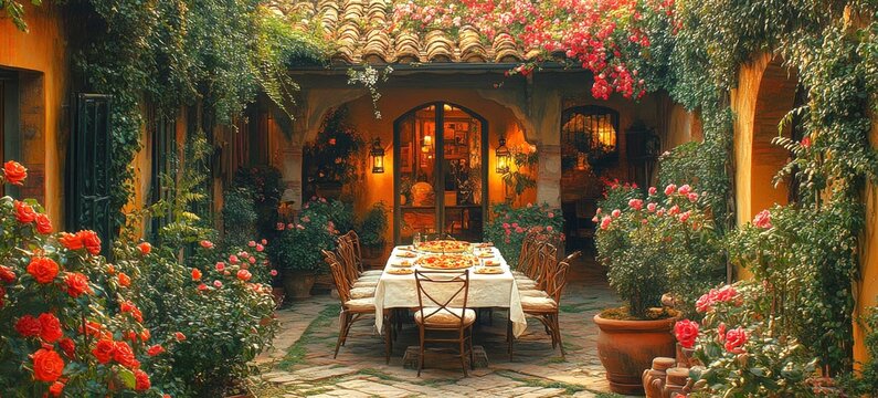Joyful family gathering around rustic table in Italian courtyard with pizza