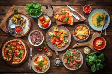 Full table of italian meals on plates Pizza, pasta, ravioli, carpaccio. caprese salad and tomato bruschetta on black background. Top view. Image generated by artificial intelligence