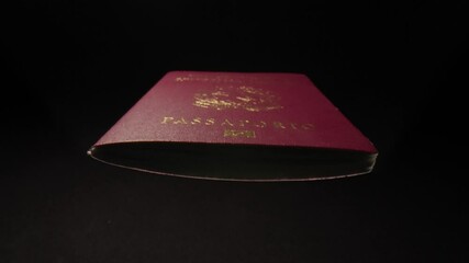 Italian passport close-up - macro shot in dark environment. Travel document hovers through the room just below the camera.