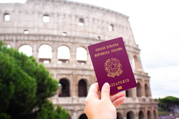 Italian passport in hand against the background of the Coliseum, Rome Italy