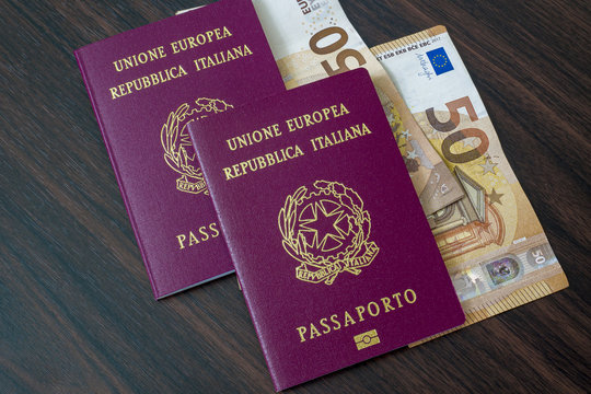 Passports, travel documents. Italian passport of the European Union and 50 euro banknotes. Travel preparations.