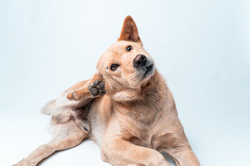 A cute brown mixed-breed dog scratches its itchy ear with its paw. Isolated on a white background. Concept for pet health, allergies, fleas, or veterinary care.