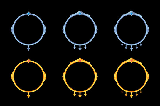 set collection circle golden and silver frames for rpg game avatars, border game with arrow decorations in medieval.