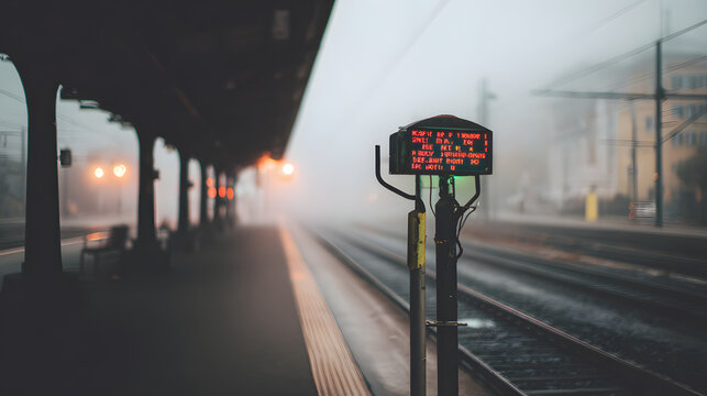 commute. Empty train platform with blurred departure board in morning fog. tourism brochures, itinerary planners, designed for hospitality marketing for hotel rooms and spa retreats.
