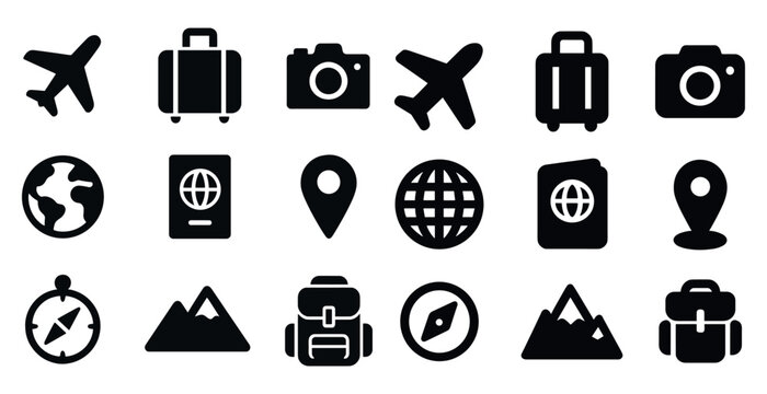 Travel and tourism icons set – solid, filled, vacation symbols for trip planning
