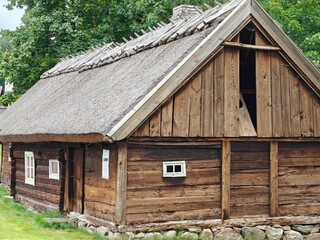 Log residential house in the Novgorod Museum of Folk Wooden Architecture "Vitoslavlitsy" on a sunny summer day, Veliky Novgorod, Russia