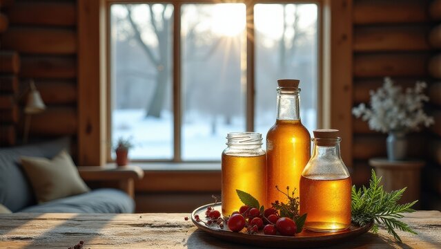 Traditional Russian drinks, Traditional izba log walls snow fields birch sap wild berries fern leaves.