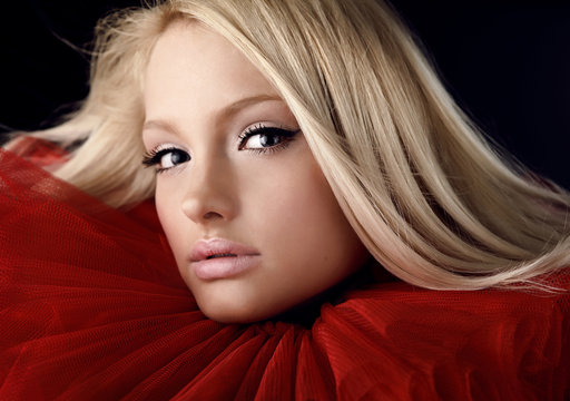 Attractive blond beauty in a red theatrical jabot. Close-up Port